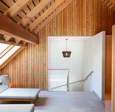 Mission : Photographie de la charpente bois de l'extension SPA et des différents bardages et habillages bois réalisés pour l'hôtel